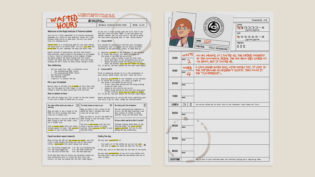 Wasted Hours is a roleplaying game for one about making the hours pass at an office desk. You will roll dice and write down on your timesheet the ways you waste time.